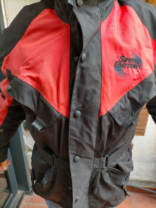 Detalles del productoChaqueta de motorista con diseño llamativo en negro y rojo. Cuenta con un cinturón ajustable a la cintura para un mejor ajuste.