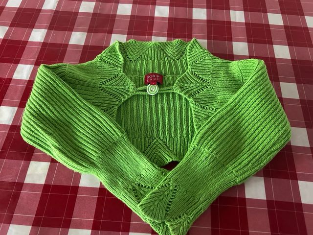 Chaqueta de punto verde para niña, talla 6. - Diseño con manga larga. - Cierre con botón. - Detalle de puntadas caladas en los puños y el cuello.