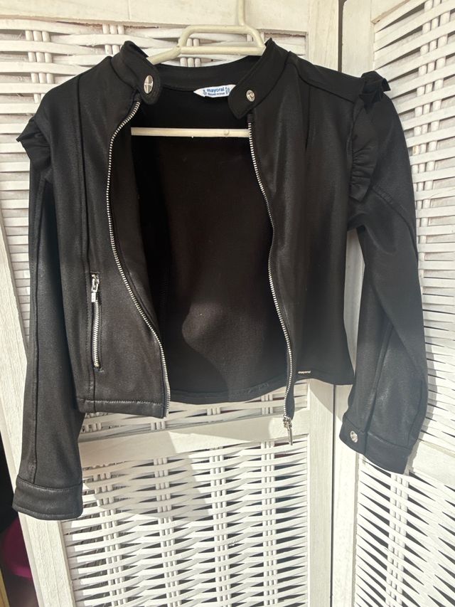 Chaqueta de polipiel para niña de la marca Mayoral. - Diseño tipo biker. - Cierre de cremallera. - Cuello mao. - Detalle de volantes en los hombros.
