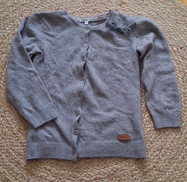Chaqueta niña en color gris con detalle de lazo de la marca Trasluz. Talla 10 años. En perfecto estado, como nueva, puesta un par de veces.