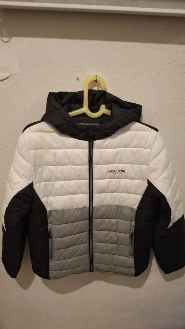 Chaqueta acolchada para niño con diseño moderno. - Color blanco, gris y negro. - Capucha. - Cierre de cremallera. - Bolsillos con cremallera.