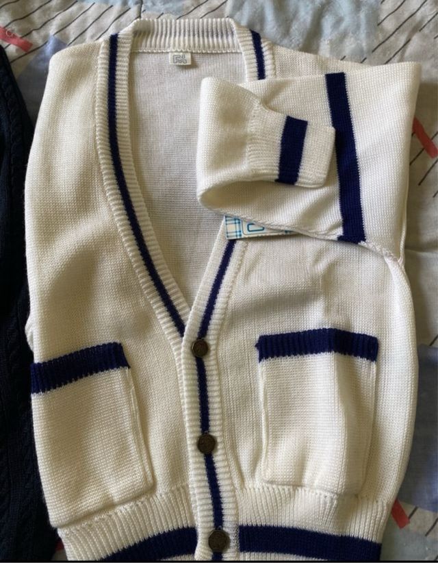 Detalles del productoChaqueta de punto en color blanco con detalles en azul marino. Ideal para cualquier ocasión. con etiqueta