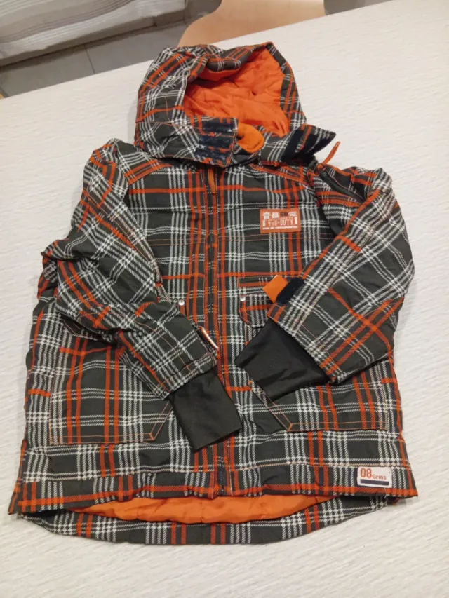 Detalles del productoChaqueta infantil de H&M con un divertido estampado de cuadros en tonos grises, naranjas y blancos. Ideal para los días más fríos.