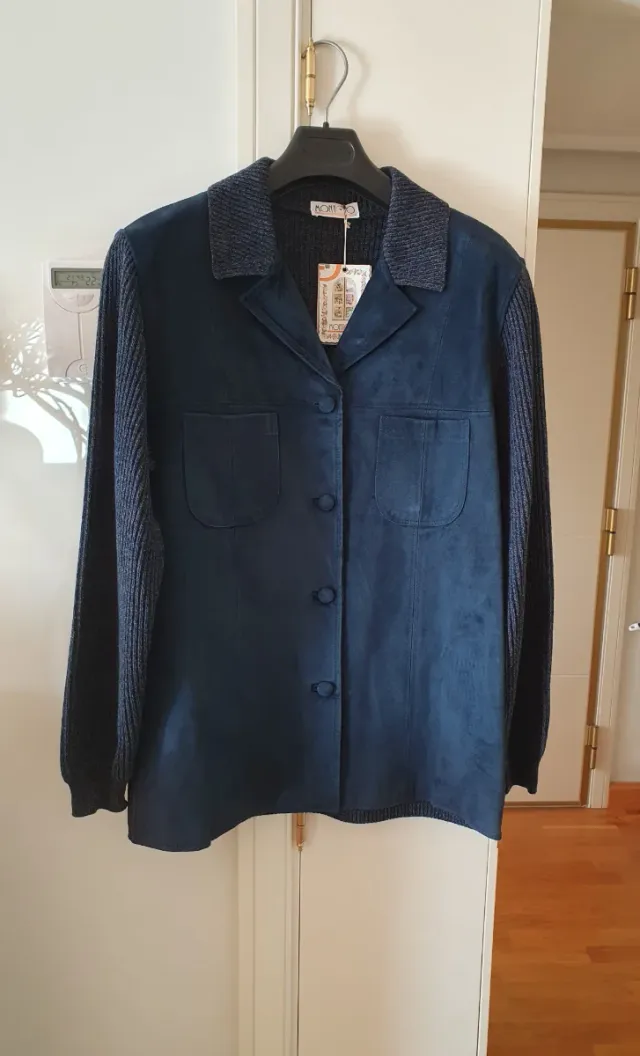 Chaqueta piel pecari y punto inglés azul jaspeada