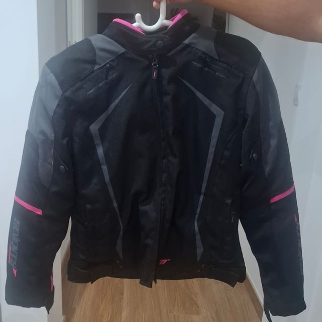 Detalles del productoChaqueta de moto Seventy para mujer, con detalles en rosa y negro. Diseñada para ofrecer ventilación.