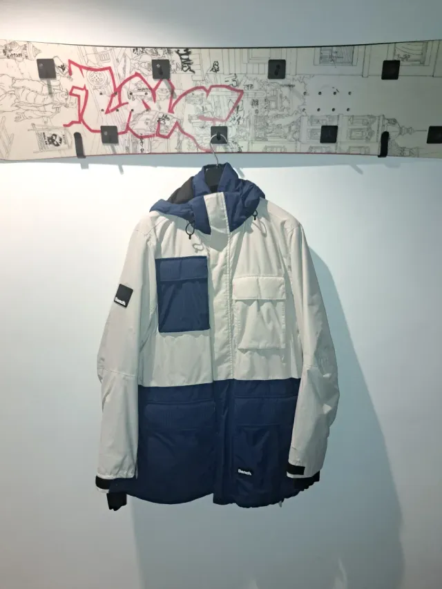 Chaqueta de snowboard con diseño bicolor azul marino y blanco. - Bolsillos frontales. - Capucha. - Ventilaciones laterales - Bolsillo Forfait