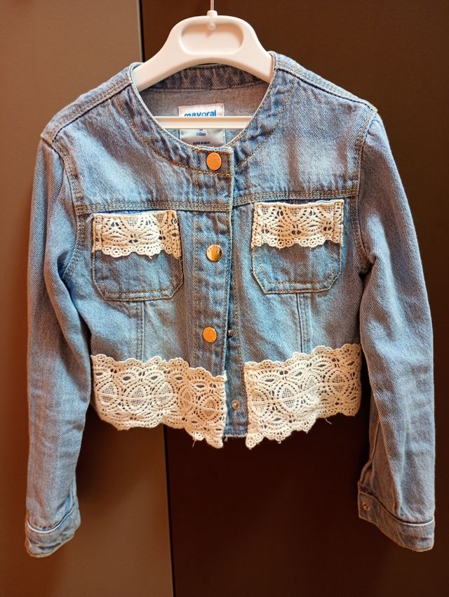 Detalles del productoChaqueta vaquera para niña de la marca Mayoral, con un diseño moderno y detalles de encaje. Talla 5 años