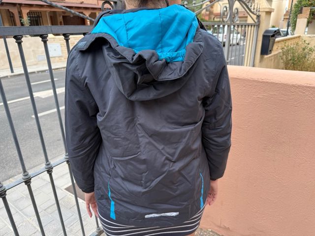 Detalles del productoChaqueta impermeable de color gris con detalles en azul.