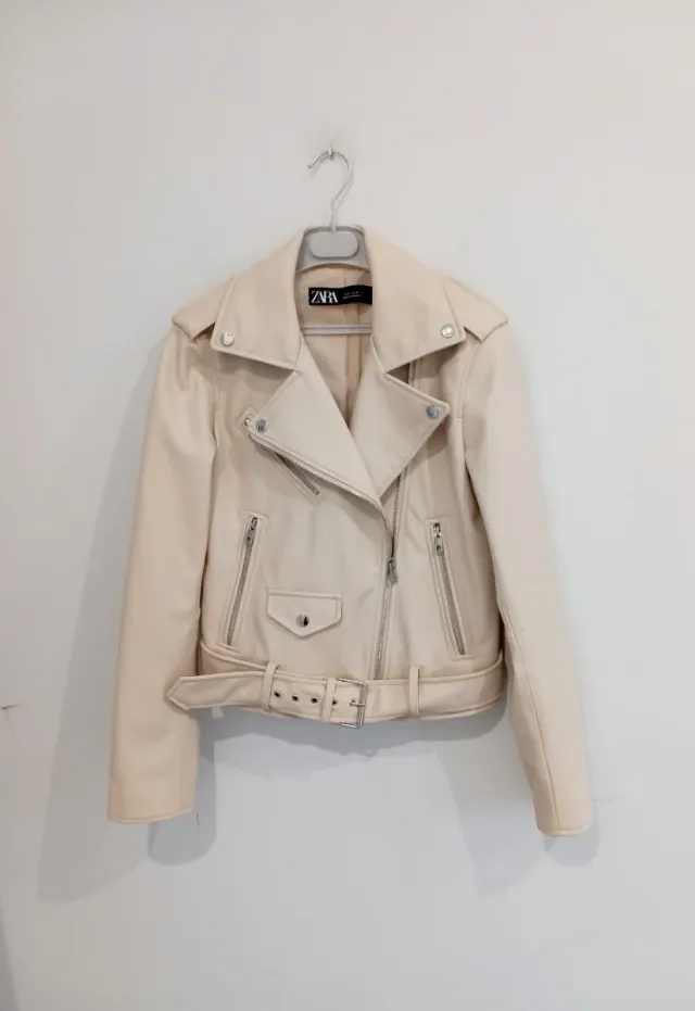 Chaqueta estilo motero de Zara en color beige. Diseño moderno con cinturón.