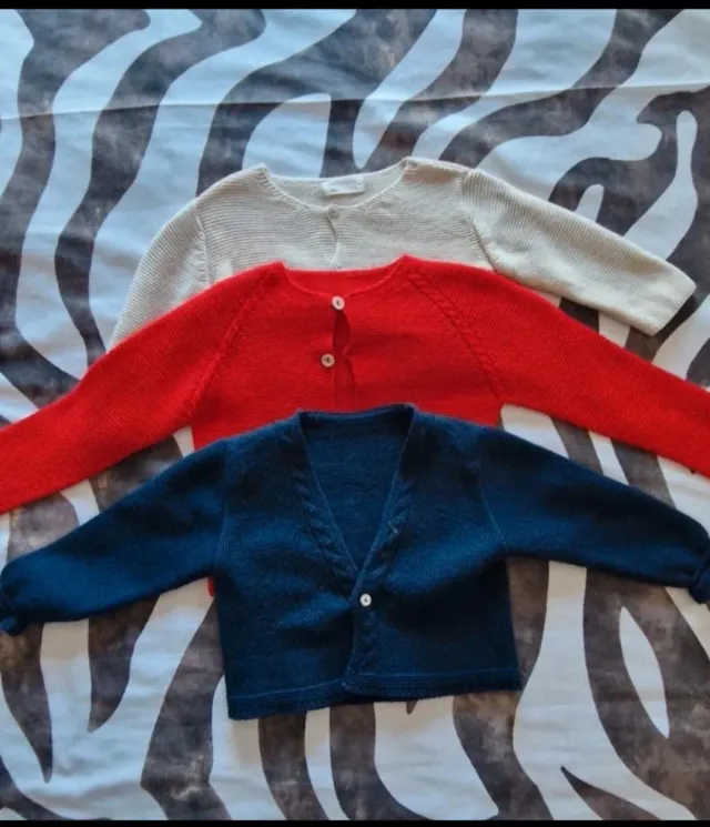 Conjunto de tres chaquetas de punto para bebé. - Chaqueta color crema con cuello redondo. - Chaqueta roja con botones. - Chaqueta azul marino con trenzado.
