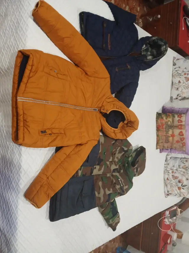 Conjunto de tres chaquetas para niños. - Chaqueta naranja acolchada con cremallera. - Chaqueta azul marino acolchada con capucha. - Chaqueta de camuflaje con cinturón.
