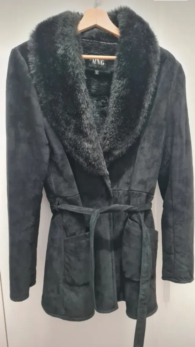 Chaquetón MNG negro con cinturón y pelo