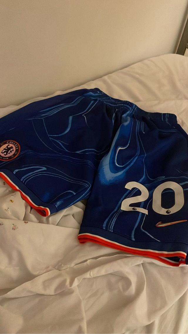Pantalón corto del Chelsea FC con un diseño moderno y deportivo. - Diseño azul con detalles gráficos. - Escudo del Chelsea FC. - Número 20 en grande.