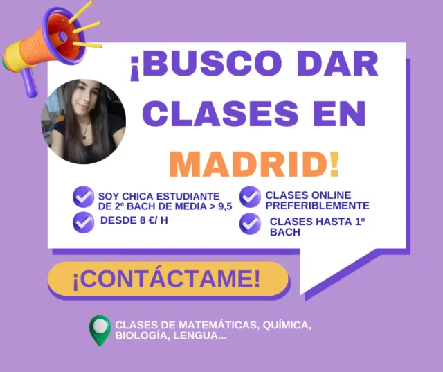 Detalles del producto¡Hola! Me presento. Me llamo Eva y soy una estudiante de 2° de bachillerato de ciencias que lleva una media superior al 9'5. Me gustaría dar clases a gente que lo necesite, desde cursos inferiores (primaria, ESO) hasta 1° de bachillerato. Puede ser Matemáticas, Química, Lengua... La asignatura que necesite. Preferiblemente serían clases online, aunque si es presencial y es cerca me podría adaptar. Mi disponibilidad son las tardes de lunes a viernes y los fines de semana completos. Me encantaría ayudar a mis alumnos para que incrementen sus notas, empleando un método basado en la comprensión de conceptos y la práctica.