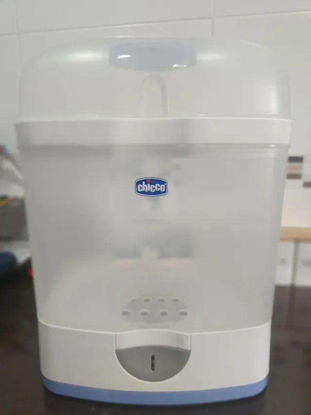 Detalles del productoEsterilizador de vapor para biberones y accesorios de bebé de la marca Chicco. Su diseño es transparente y blanco con detalles en azul.