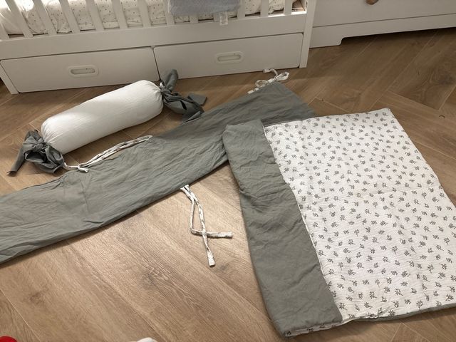Conjunto de chichonera, cojín y manta a juego para cuna. - Chichonera larga de tela verde oliva - Cojín blanco alargado. - Manta con estampado floral olivo