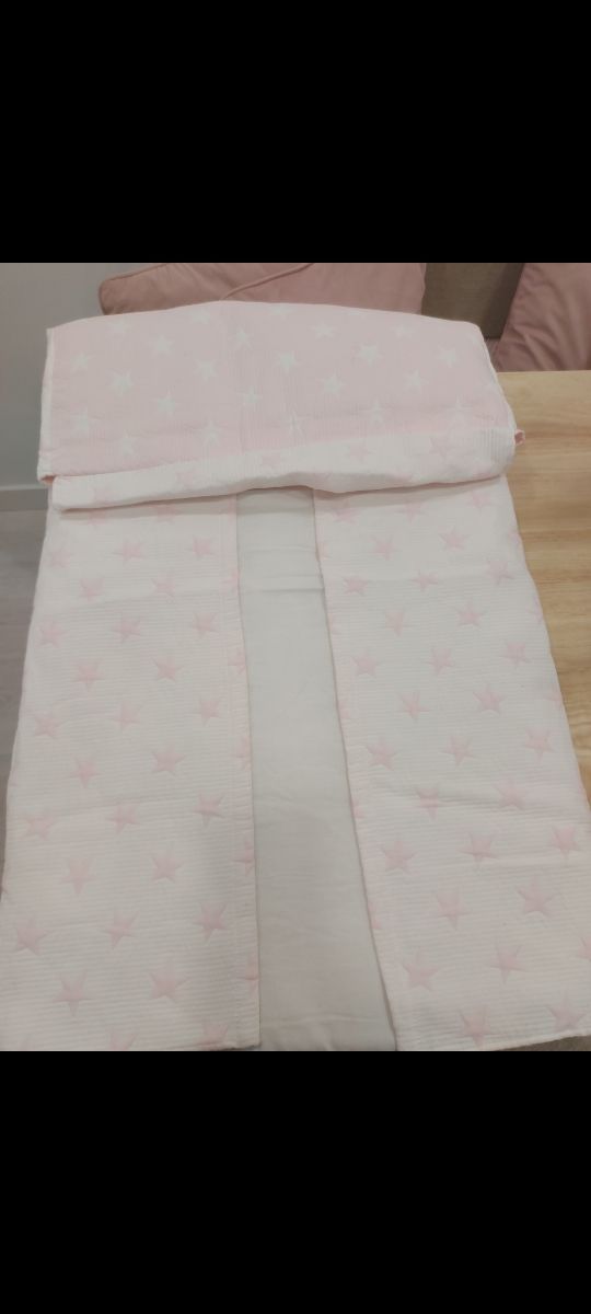 Detalles del productoProtector de cuna con un bonito diseño de estrellas en color rosa sobre fondo blanco. Aporta un toque tierno y seguro al espacio de descanso del bebé.