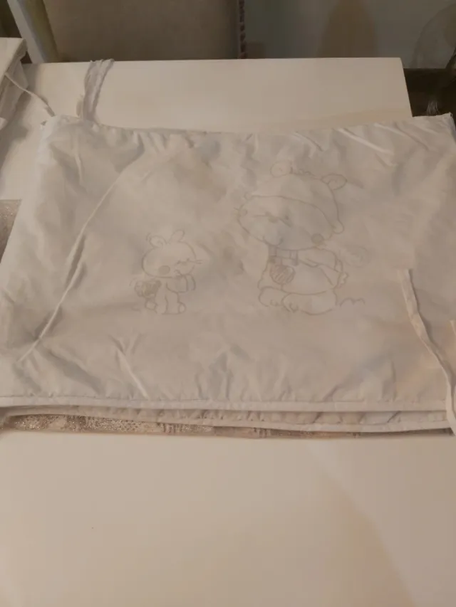 Protector de cuna con un diseño tierno de animalitos. - Tejido blanco con estampado de ositos y conejitos. - Cierre con cordones.