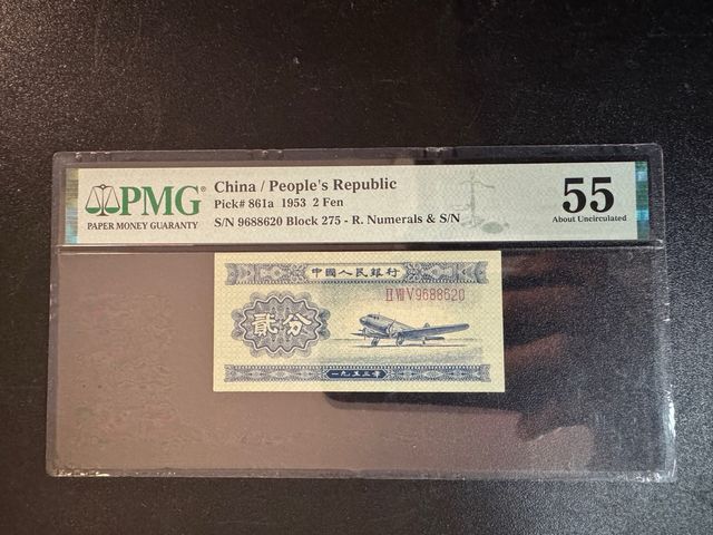 Detalles del productoBillete de 2 Fen de la República Popular China, emitido en 1953. Certificado por PMG con una calificación de 55 (About Uncirculated).