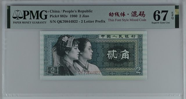 China 2 Jiao 1980 Billete PMG 67 EPQ