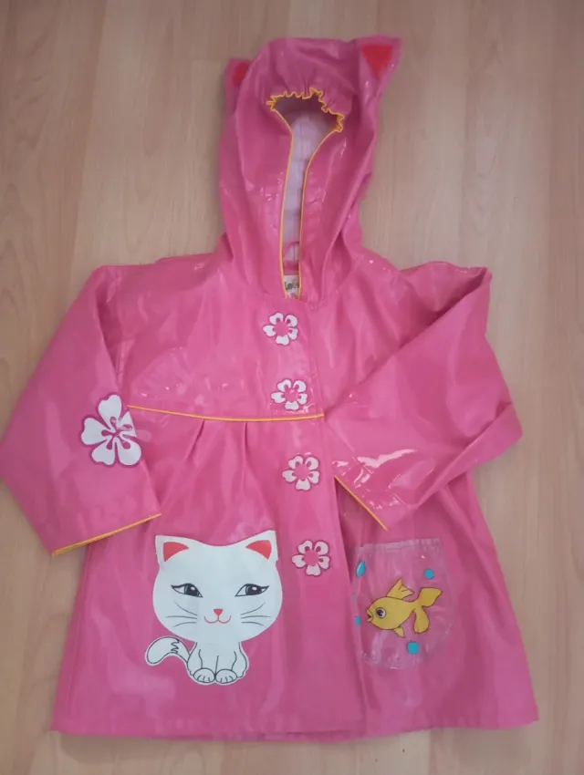 Detalles del productoChubasquero rosa para niña con divertido diseño de gato y pez.