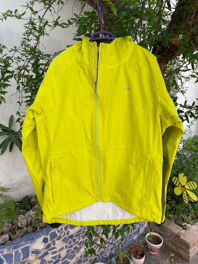 Detalles del productoChubasquero para ciclismo Rapha, ideal para trayectos urbanos y protegerte de la lluvia. Es de color amarillo. La capa interior está un poco desintegrado en el parte del cuello (ver fotos).