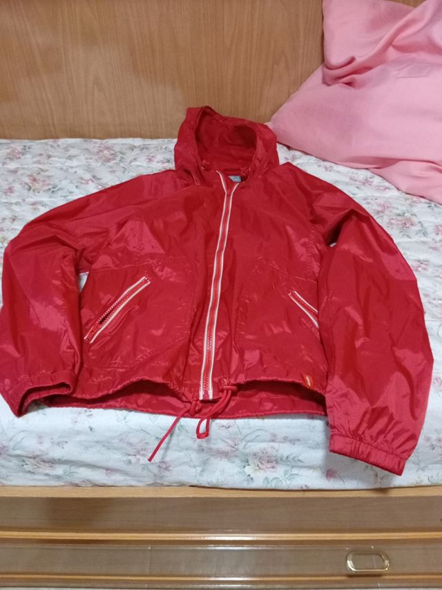 Chubasquero Rojo de la marca NAFNAF de la talla L está muy poco usado con bolsillos en los laterales con capucha y ajustable en la cintura
