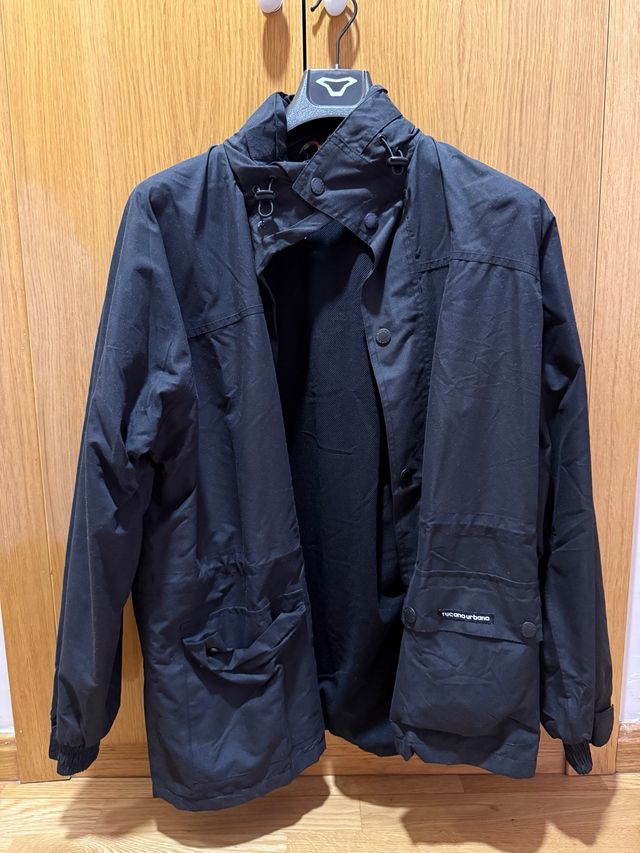 Chaqueta negra Tucano Urbano para moto, en buen estado. - Impermeable. - Con capucha. - Bolsillos funcionales. - Detalles reflectantes.