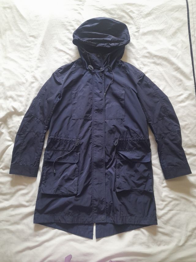 Parka chubasquero mujer Azul marino muy bonito.100% algodón.Marca U de Adolfo Domínguez. Medidas Ancho 48cm-Largo 84 cm-Largo Manga 56 cm-Largo cuello manga 70cm-Pecho 54 CM. PRECIO NO NEGOCIABLE. Envío Rápido.