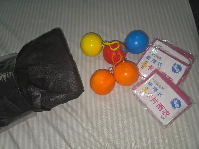 Conjunto de chubasqueros desechables, cada uno guardado en una bola compacta para llevar fácilmente.