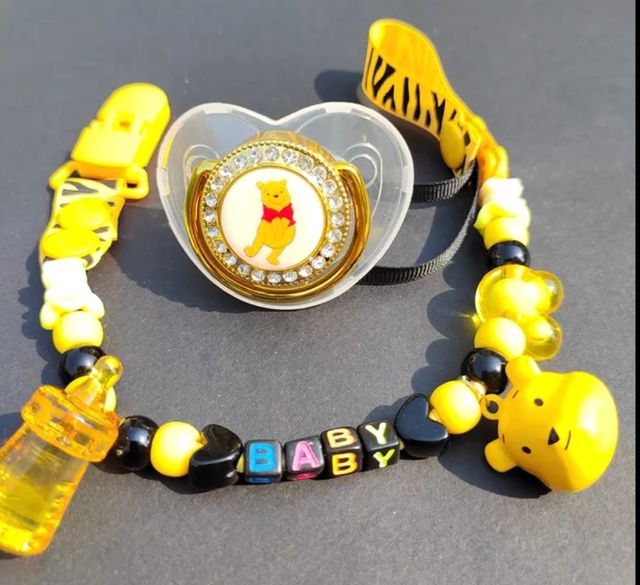 Chupete Winnie The Poth transparente o dorado metalizado Tetina silicona 0 a 6 meses + cadena sílicona y charm Winnie SONAJERO baby 3 unidades disponibles!