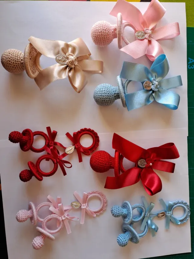 Detalles del productoPreciosos chupetes hechos a mano, de ganchillo,perfectos para el carrito o la cuna del bebé. Cada uno esta adornado con un lazo de satén y una medalla de la Virgen Milagrosa.