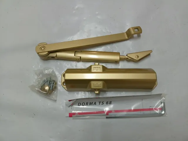Detalles del productoCierra puertas hidráulico de la marca Dorma, modelo TS 68, en acabado dorado. Incluye todos los accesorios necesarios para su instalación.