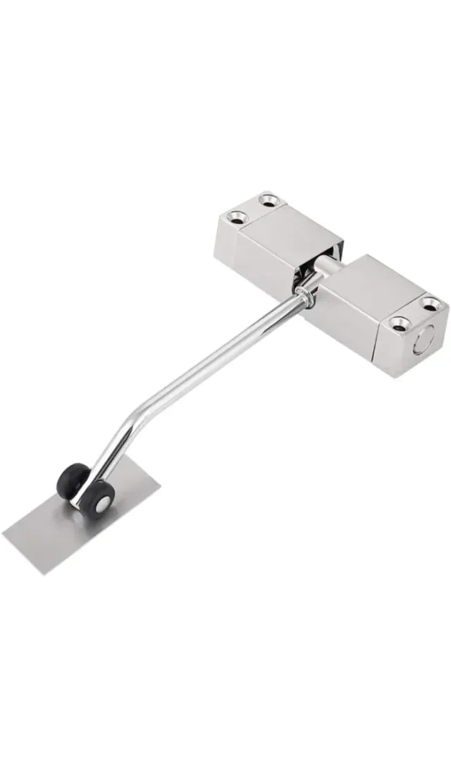 Dispositivo para cierre automático de puertas. Fabricado en metal cromado. - Mecanismo de cierre suave. - Incluye brazo y rodillos. - Base plana para montaje.