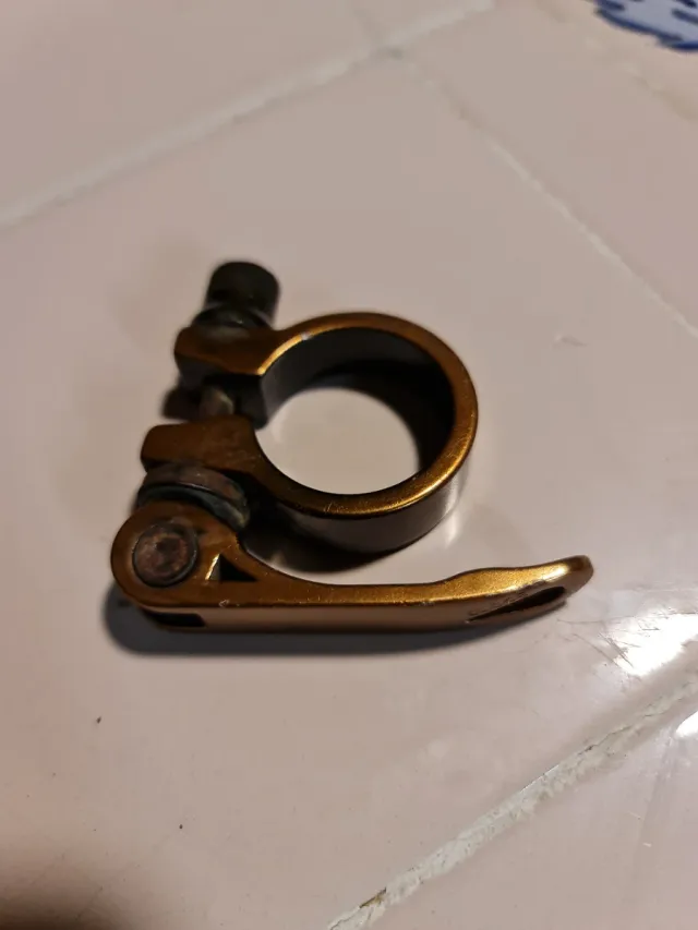 Detalles del productoCierre de sillín para bicicleta fabricado en aluminio con un acabado en color bronce. El diámetro de la abrazadera es de 31.8mm.