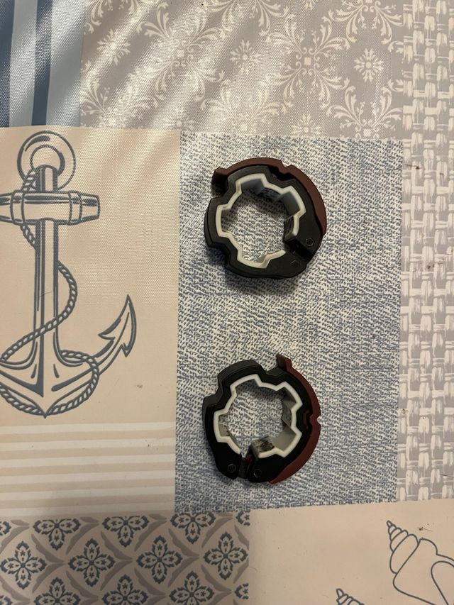 Dos cierres de seguridad para discos de pesas. Para barras de 28mm. - Color negro y marrón. - Diseño para discos de fitness.