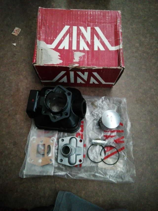 Detalles del productocilindro completo diametro 43.40mm de 65cc, marca euro kit, incluye: toma admisión, cilindro, pistón, segmentos, bulon, clips y juntas, recambio nuevo a estrenar de la época, nunca usado, nunca montado, válido para Rieju RV y Drac 50, motor minarelli 4 y 5 velocidades.
