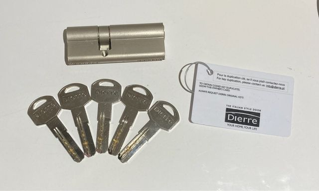 Cilindro de seguridad para puerta de entrada vivienda. 30x50 mm. Con las 5 copias de llaves originales y la tarjeta de código para nuevas copias. Sólo dos meses de uso.