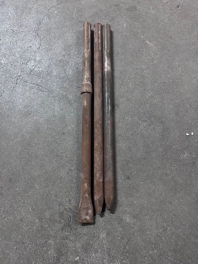 Set de tres cinceles o punteros para martillo compresor. Están hechos de metal resistente. - Un cincel plano. - Dos cinceles puntiagudos.