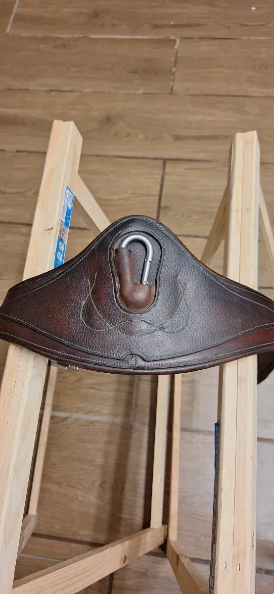 Cincha anatómica Antarès medida 135. - Material de cuero de alta calidad. - Elásticos nuevos. - Hebilla y mosquetón de acero inoxidable. - Diseño ergonómico.
