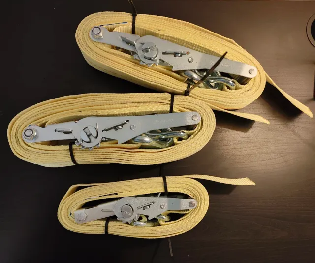 Detalles del productoConjunto de 3 cinchas de carga con tensor de carraca y gancho. 2 cinchas de 6 m de carga máxima 2000 kg y otra de 5 m de carga máxima 1000 kg.