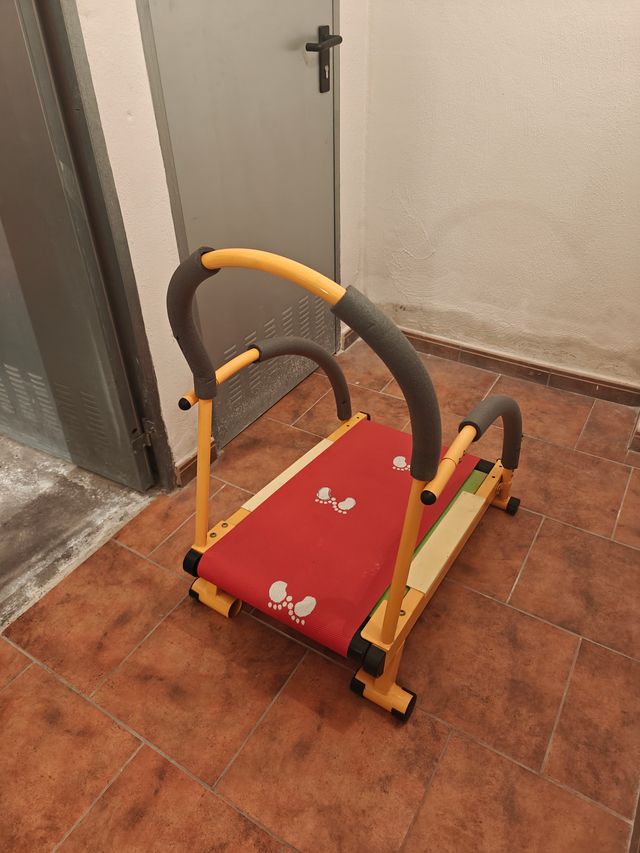 Cinta de andar para niños con diseño divertido. - Estructura de metal amarillo. - Superficie de rodadura roja con huellas. - Empuñaduras acolchadas.