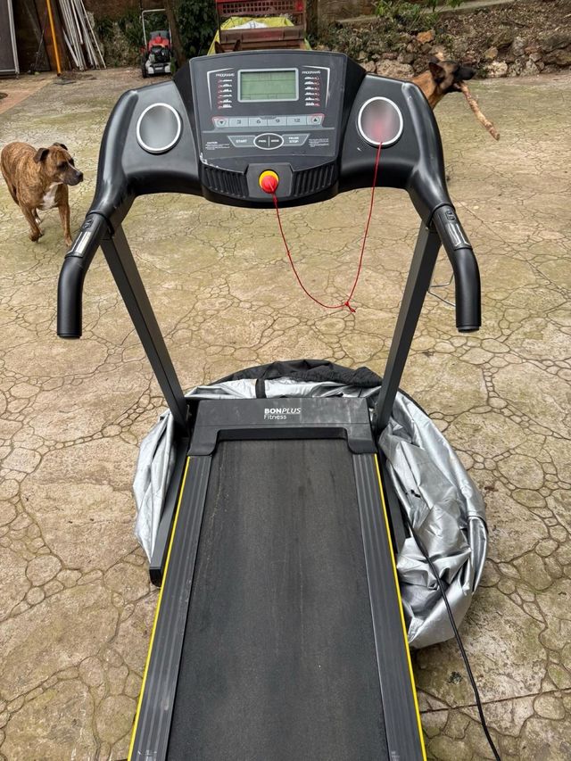 Cinta de correr Bonplus Fitness en color negro con detalles amarillos. - Diseño moderno y funcional. - Superficie de carrera amplia. - Consola con pantalla digital.