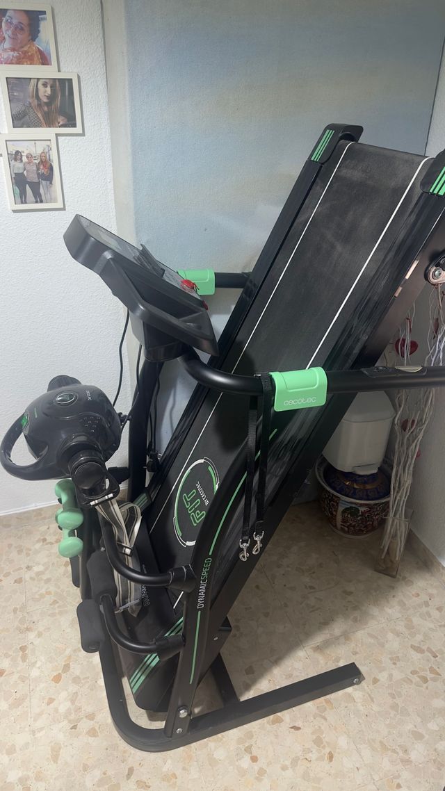 Cinta de correr Cecotec FIT DYNAMIC en color negro y detalles en verde. Incluye dos pesas pequeñas y una cinta vibratoria. Plegable.