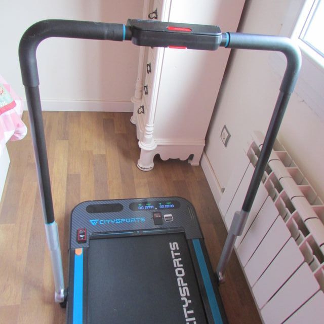 Detalles del productoCITYSPORTS cinta de correr/caminar eléctrica, altavoces bluetooth, velocidad ajustable, de 1 a 6 km/h., pantalla LCD que marca calorías, distancia recorrida y velocidad, delgada y silenciosa, con ruedas para moverla mas fácilmente. Tiene una barra para sujetarte si quieres mientras corres o paseas, muy útil para no perder el equilibrio, plegable, por ello, al acabar de usarla puedes dejarla desplegada o plegarla hacia abajo. Nota: He visto varias a la venta, sin barra para sujetarte, mas caras, y también otra exactamente igual, con barra plegable, bastante mas cara. No se envía.