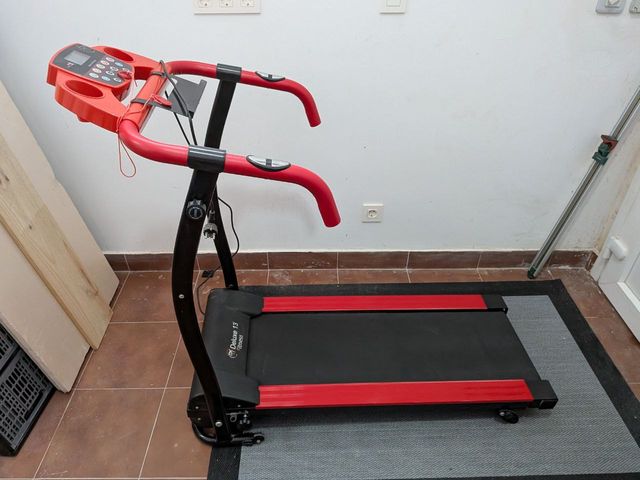 Detalles del productoCinta de andar y correr eléctrica con un diseño moderno en color rojo y negro.