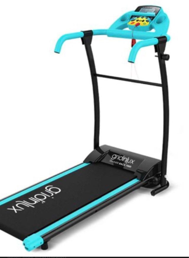 Cinta de correr de la marca Gridinlux, modelo TRAINER RACE 7000. - Diseño moderno en color negro y azul. - Consola con pantalla. - Empuñaduras ergonómicas.