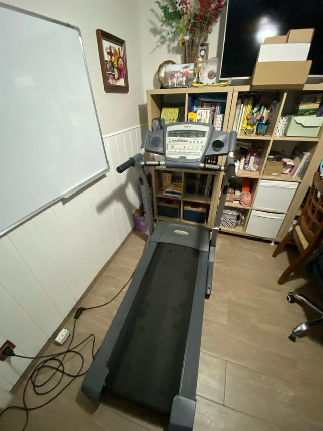 Cinta de correr en color gris, ideal para entrenar en casa. - Diseño moderno y funcional. - Superficie de carrera amplia. - Panel de control integrado.