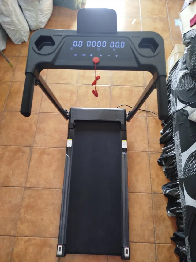 Cinta de correr de color negro, con pantalla digital y soporte para móvil. - Diseño moderno y compacto. - Superficie de carrera amplia. - Panel de control intuitivo.