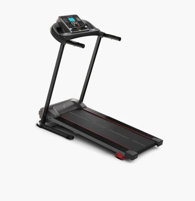 Cinta de correr negra con detalles en rojo, ideal para entrenar en casa. - Diseño moderno y compacto. - Superficie de carrera amplia. - Pantalla digital integrada.